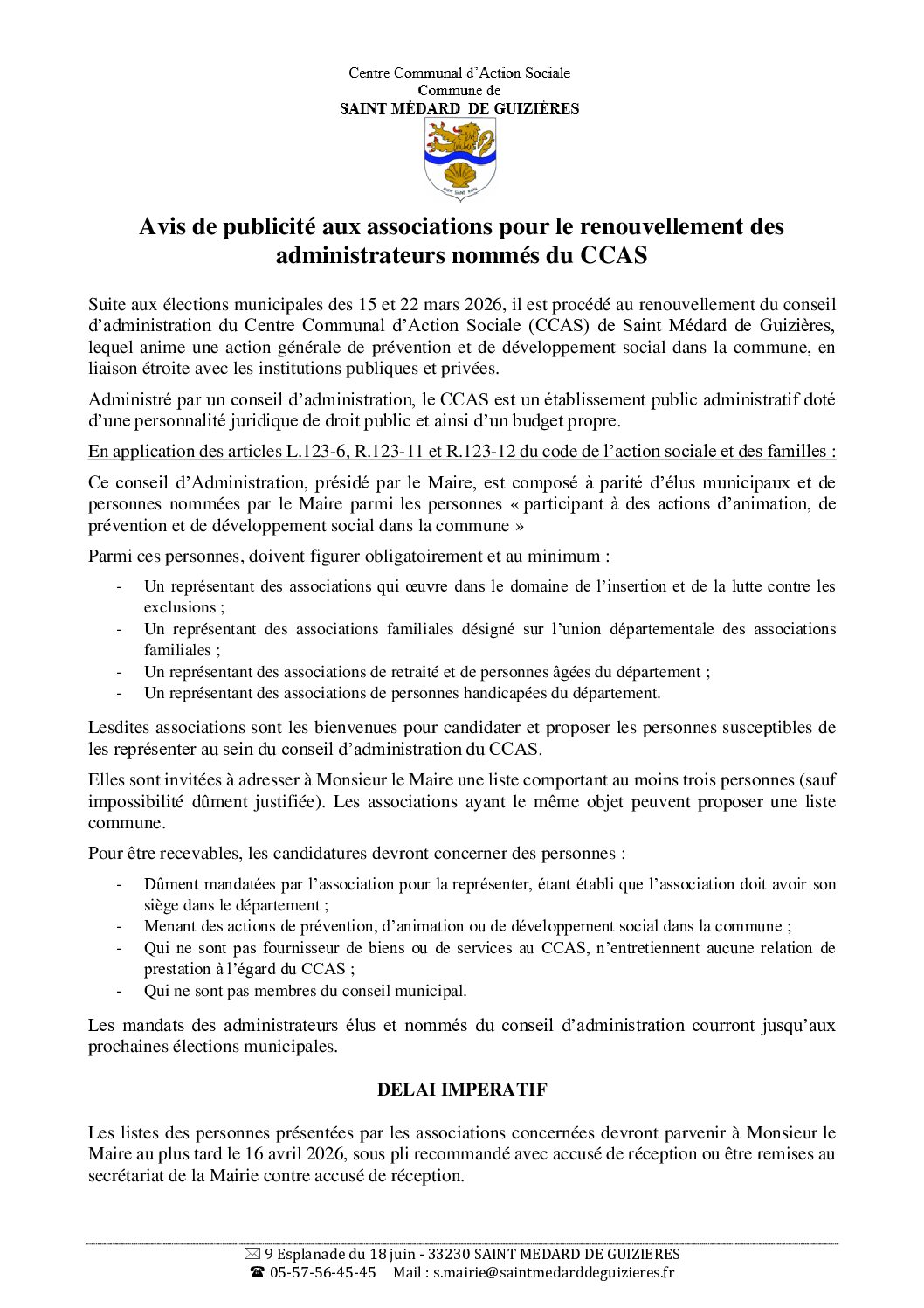 Avis de publicité aux associations pour le renouvellement des administrateurs nommés du CCAS 31 mars 2026